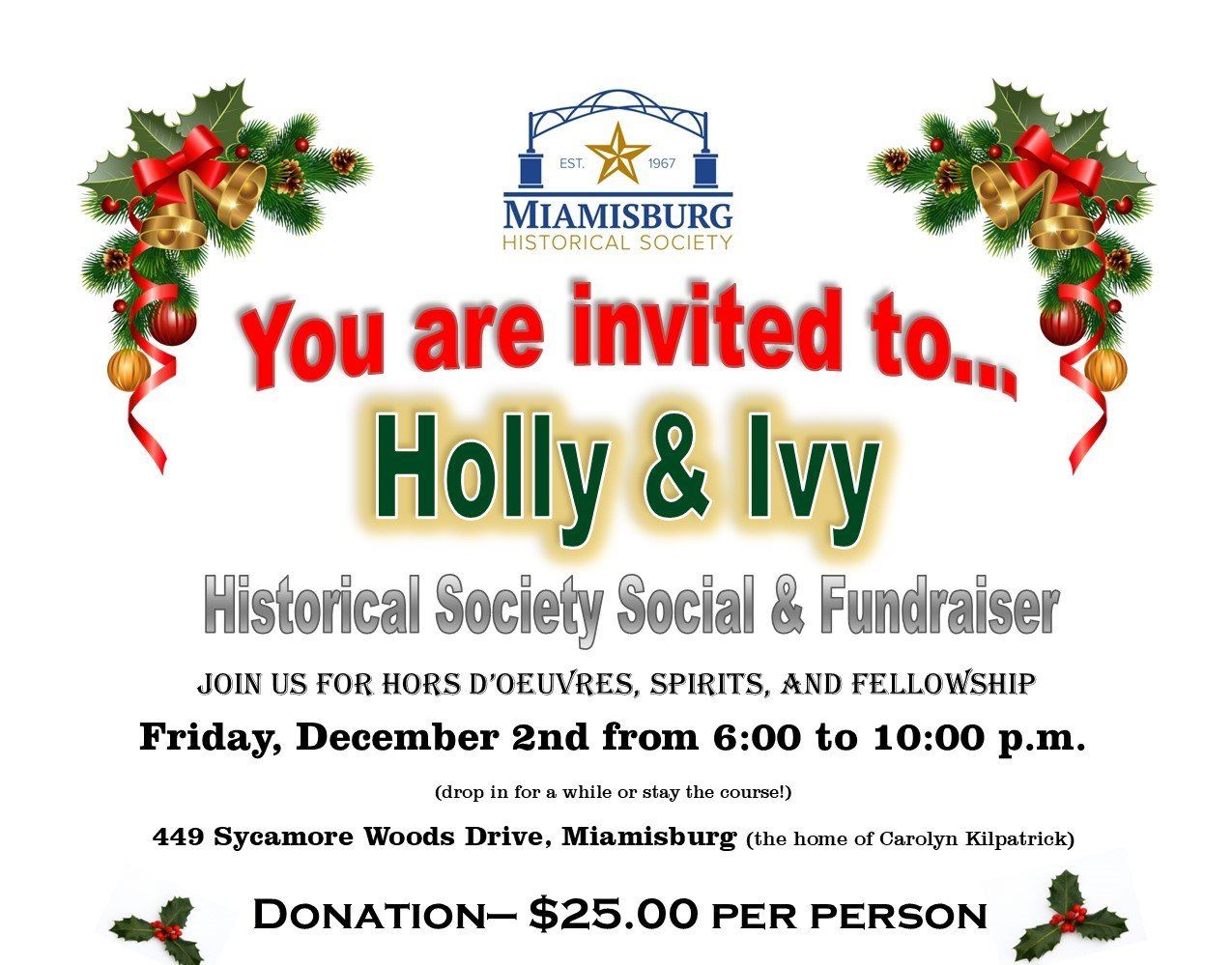 For the first time in several years, we were able to schedule the Holly & Ivy annual fundraiser. A special thank you to Carolyn Kilpatrick for opening her home and hosting the event. Attendance was pretty good and our Society treasurer (Carolyn) says that we raised over $500 for the Historical Society budget.