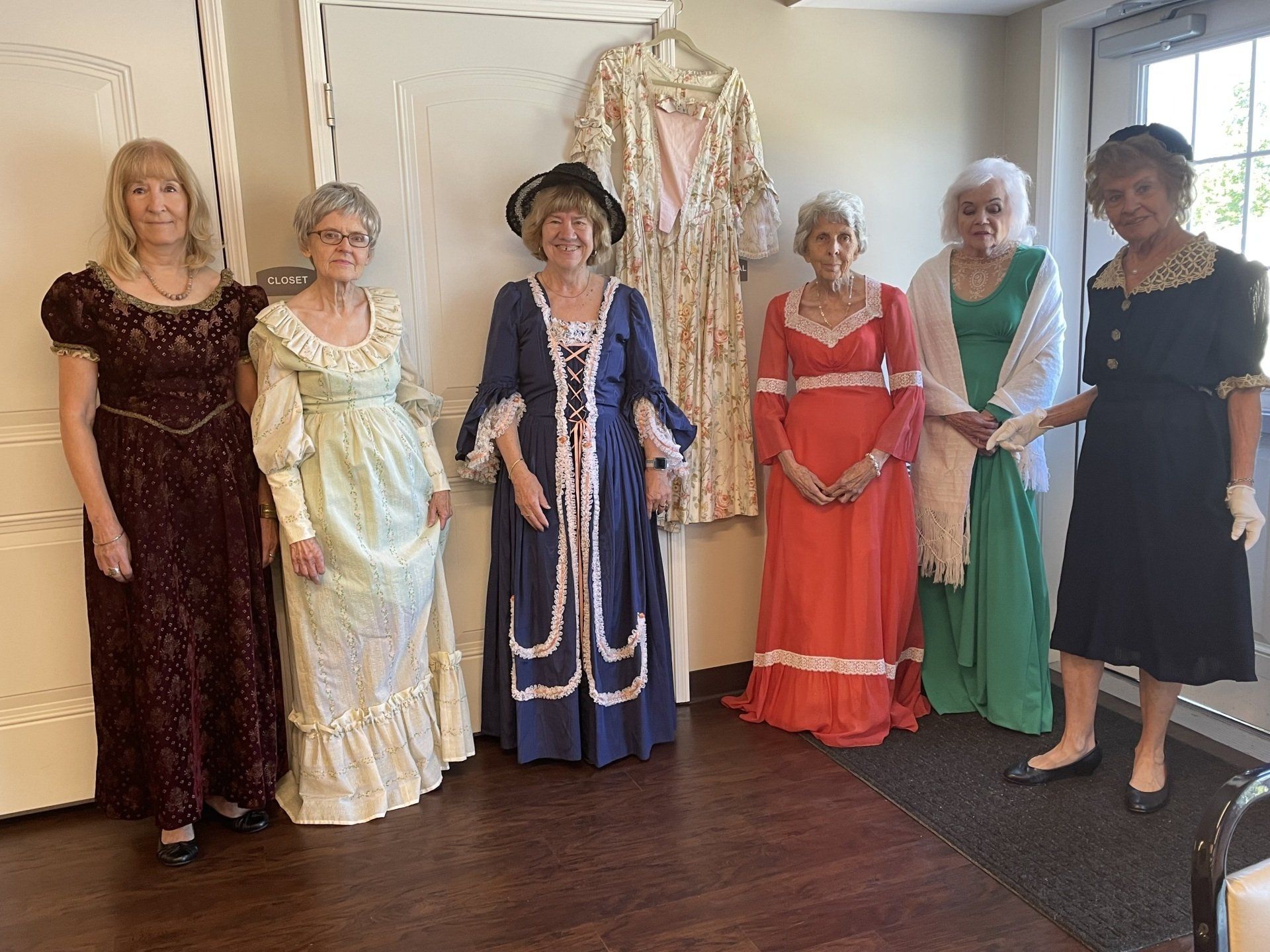 We received a call from the Sycamore Creek Apartments activities coordinator. She had heard about a vintage style show that we had staged many years ago and was interested to know if we do could one for a tea party they had planned. We set right to work. Bobbye Sweny loaned us some of her collection and we retrieved others from the archive room in the History Center. Then we had to find enough women thin enough to wear them. Success! Two resident ladies were more than happy to be asked to be part of the program. They joined three of us from the Miamisburg Historical Society. Carolyn Kilpatrick was the emcee for the program. Rounding out the show were Brenda Robinett Hill, Linda Leas, and me. The show was a great success. The women, many in decorative vintage style hats, were delighted. Our resident models were Ann, who chose a stylish two-piece outfit and a lovely gown, and Mary, who modeled a classic dress. Thank you to the Sycamore Creek activities coordinator and everyone for a wonderful time and a delightful luncheon and tea.
